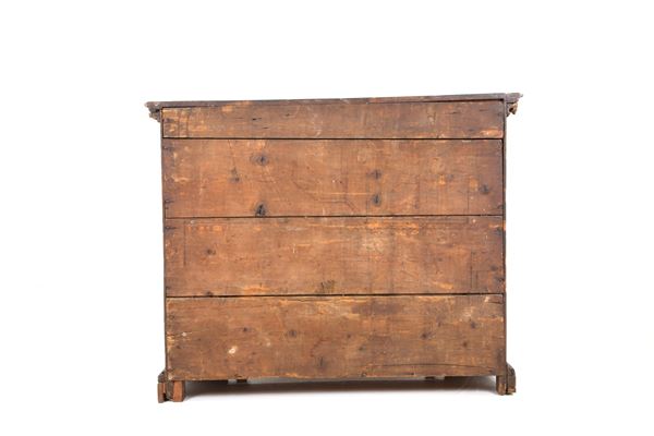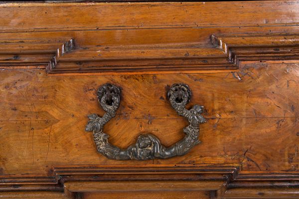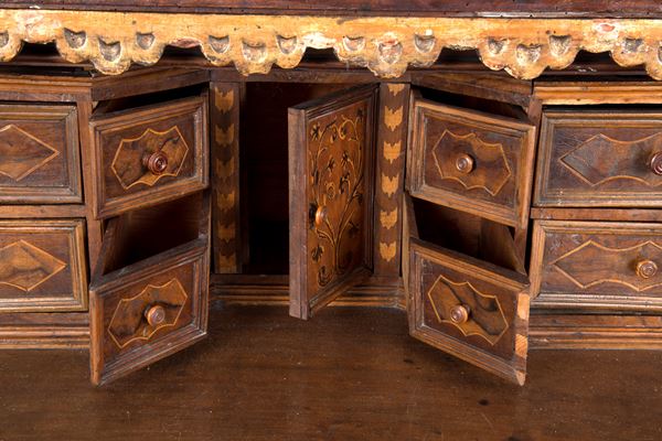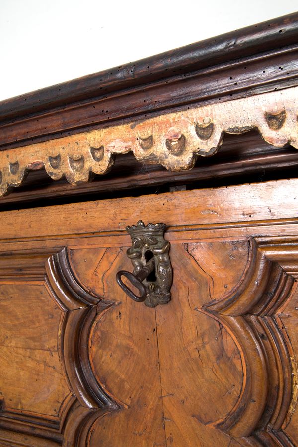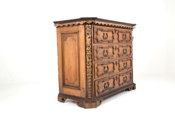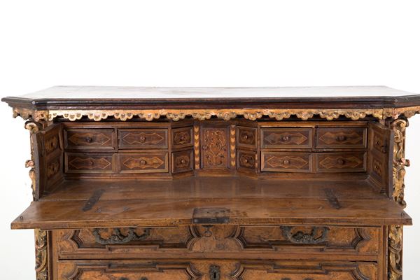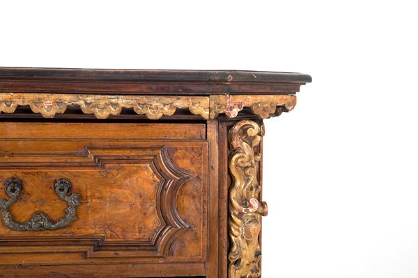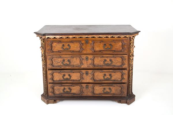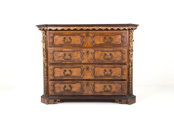 Walnut chest of drawers partially veneered in briar root with four drawers, one of which is a drop-leaf drawer and pilaster strips in carved and gilded wood. Lombardy. 17th century. Defects.