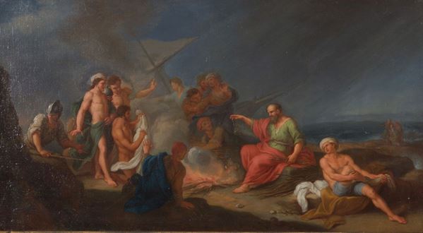 ANONIMO FRANCESE attivo a Roma nel XVIII secolo (ETIENNE PAROSEL (STEFANO PARROCEL) detto IL ROMANO? (Avignone, 1696-1776). Dipinto olio su tela raff. ''NAUFRAGIO DI SAN PAOLO A MALTA''. In cornice. GiÈ rintelato e rintelaiato.