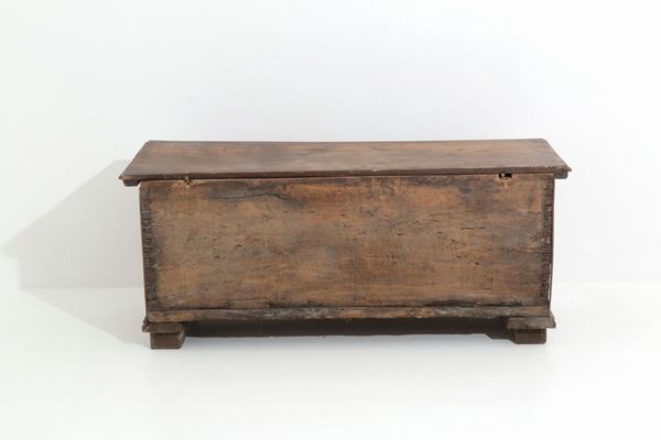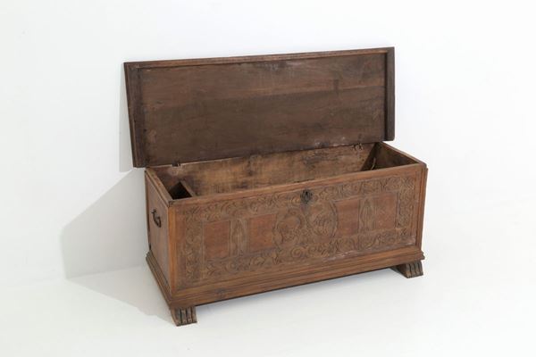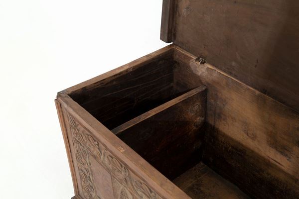 Cassapanca in legno di noce intagliato a motivi floreali con piedi leonini e maniglioni in ferro sui fianchi. Toscana. XVII secolo.