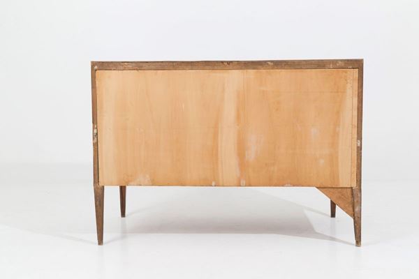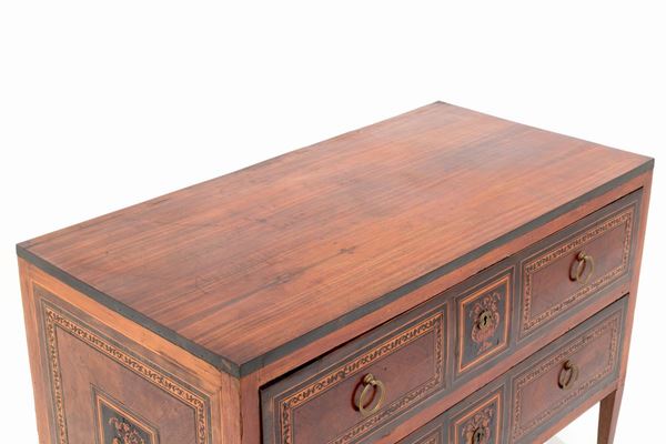 Cassettone in legno intarsiato. Napoli. Periodo Luigi XVI. Con piano e schienale non coevi.