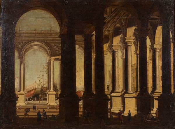 VIVIANO CODAZZI (Attr.) (Valsassina, 1604. Roma, 1672). Dipinto olio su tela raff. ''SCORCIO DI PORTO CON MARINA''