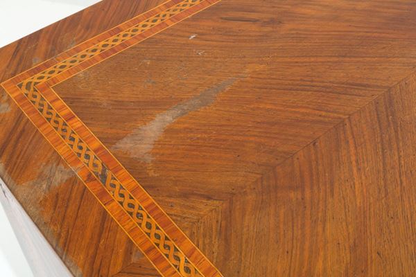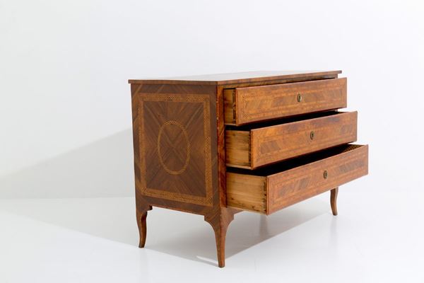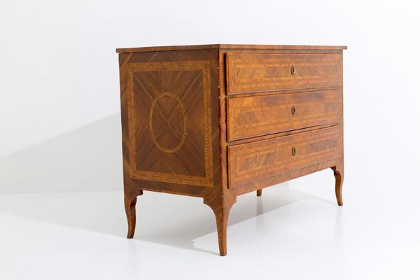 Comò lastronato e intarsiato in legni vari con tre cassetti