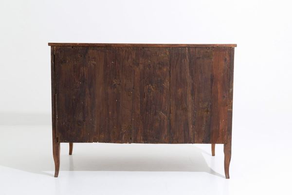 Comò lastronato e intarsiato in legni vari con tre cassetti. Periodo Luigi XVI. Lievi difetti e piano non coevo.