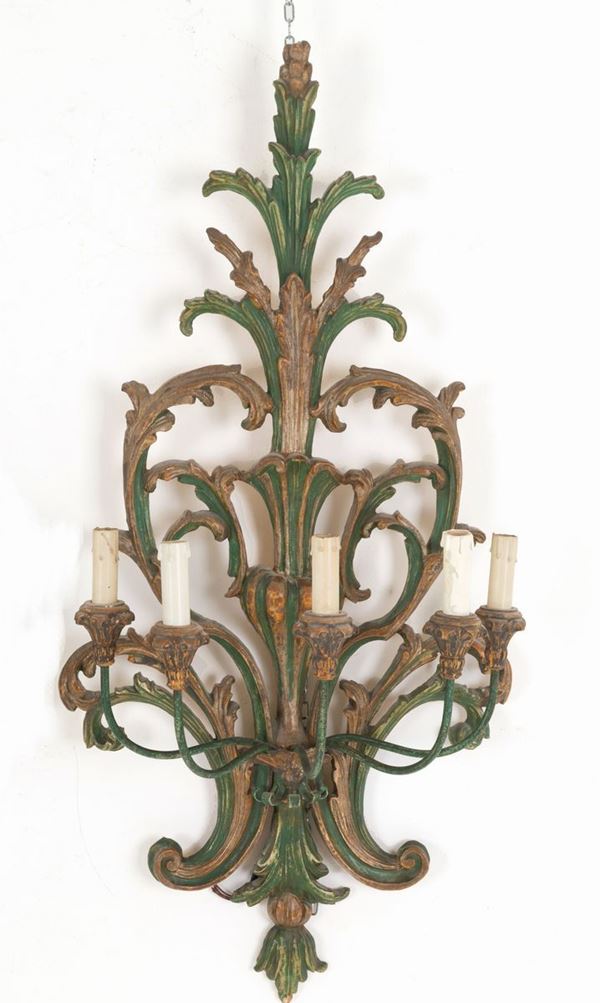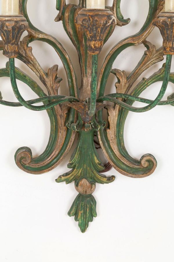 Coppia di applique cinque luci in legno intagliato e laccato con bracci in ferro. Inizi XX secolo.