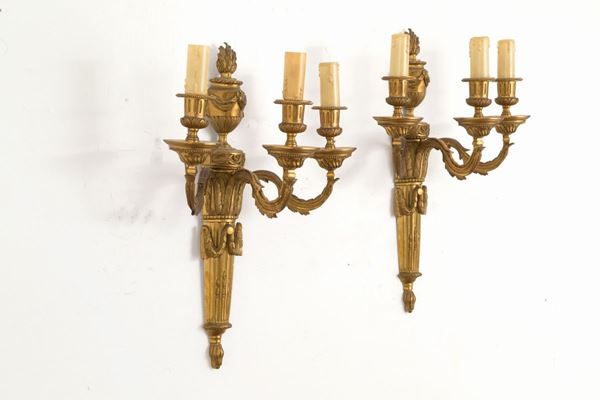 Coppia di applique tre bracci in bronzo cesellato e dorato. XIX secolo.