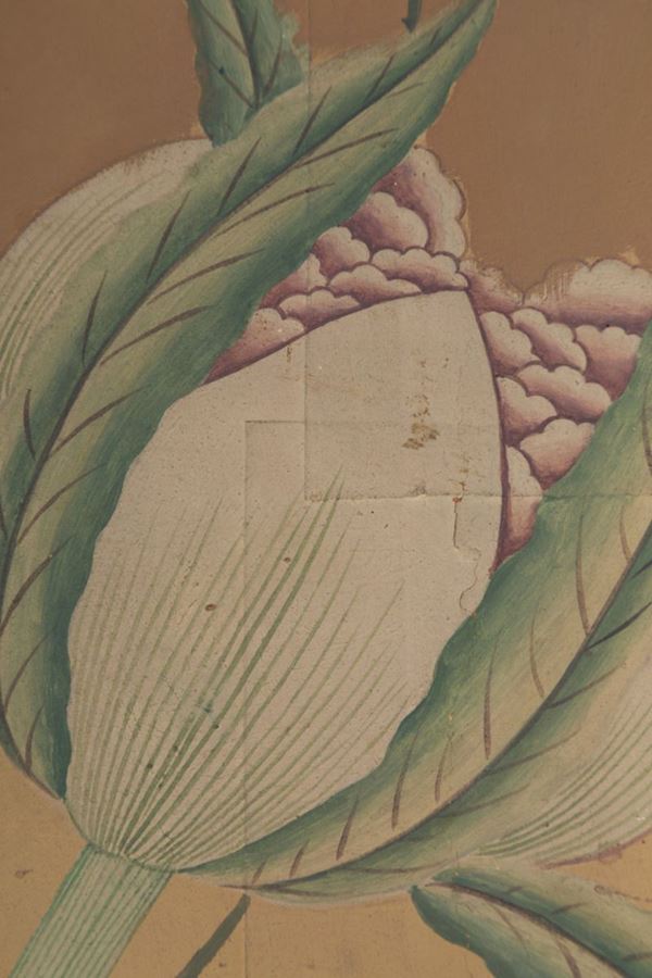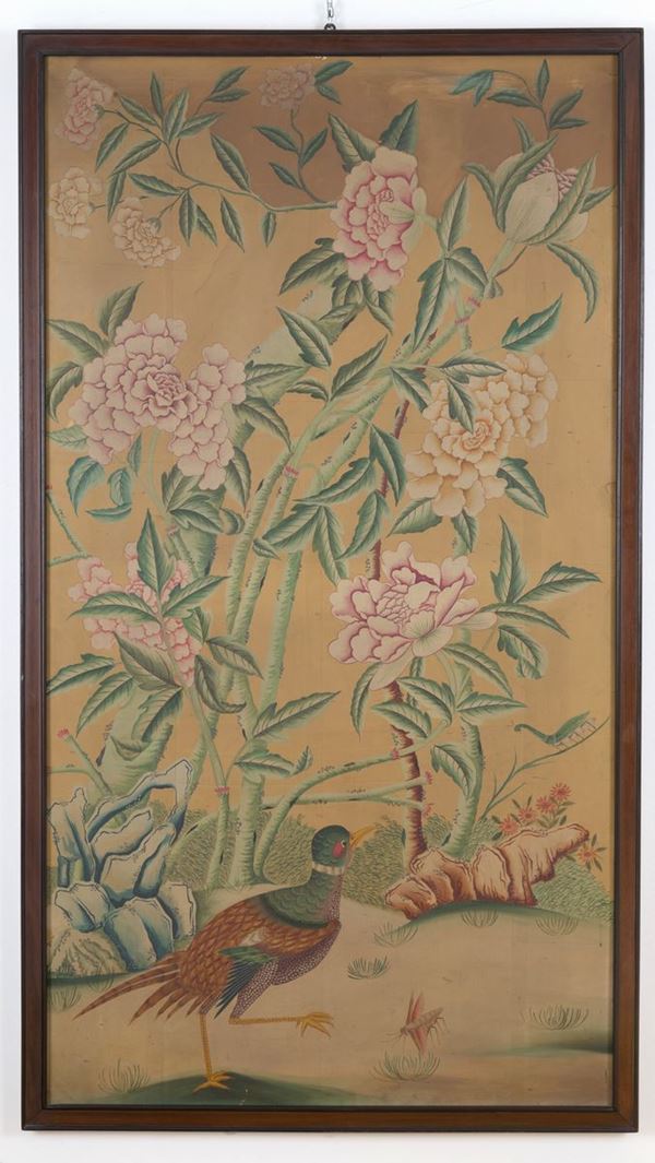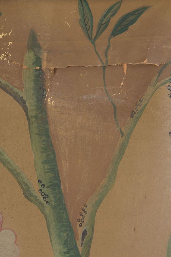 Coppia di dipinti olio su cartone applicato su tela raff. ''RAMAGE DI FIORI CON UCCELLI DEL PARADISO''. Cina. XIX secolo. In cornice. Difetti e restauri.