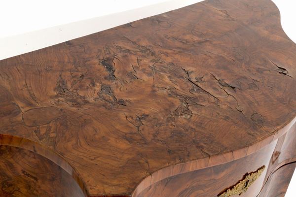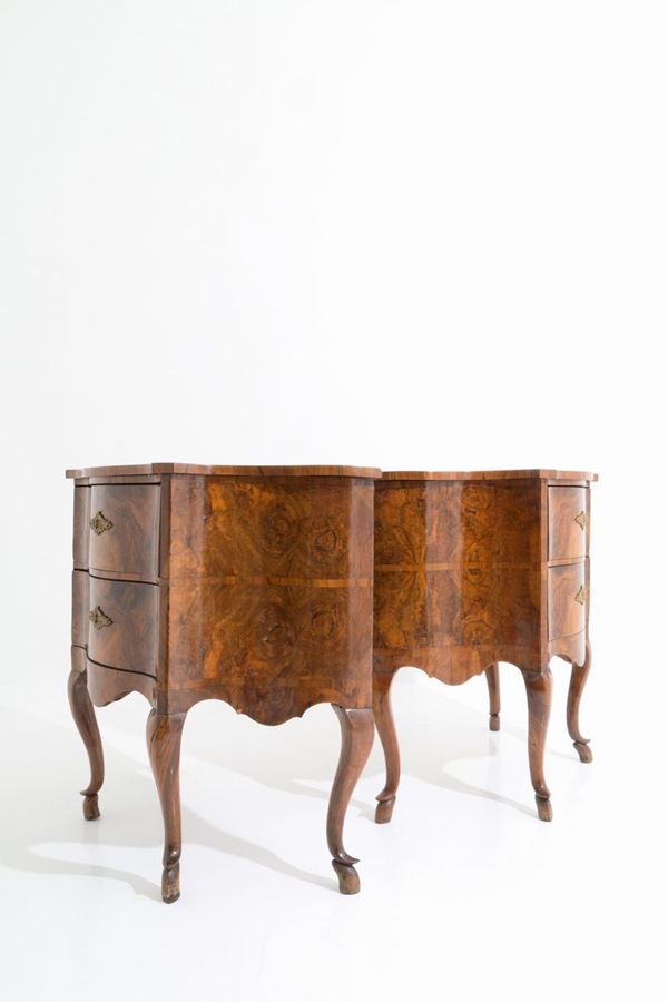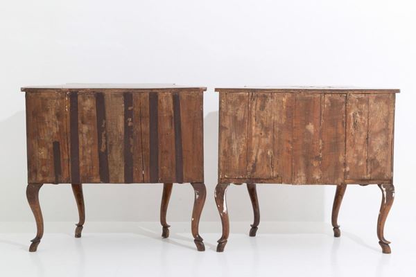 Coppia di piccoli comò lastronati in radica di noce con fronte e fianchi mossi. XVIII secolo. Ferrara. Difetti e restauri.