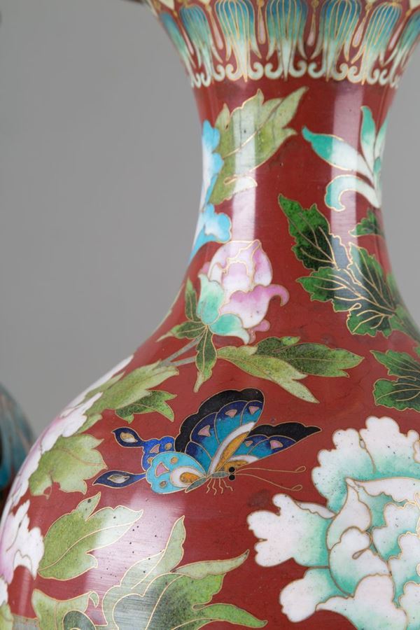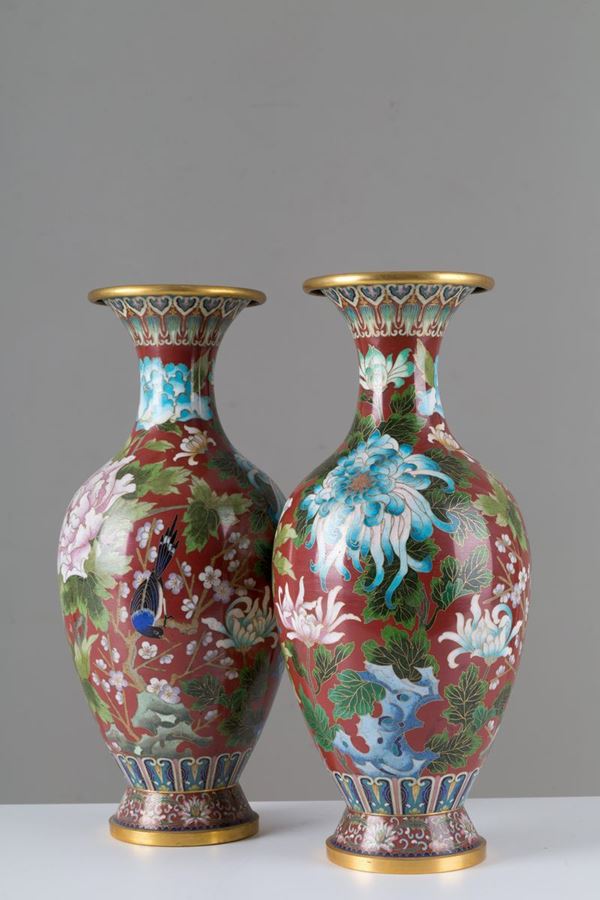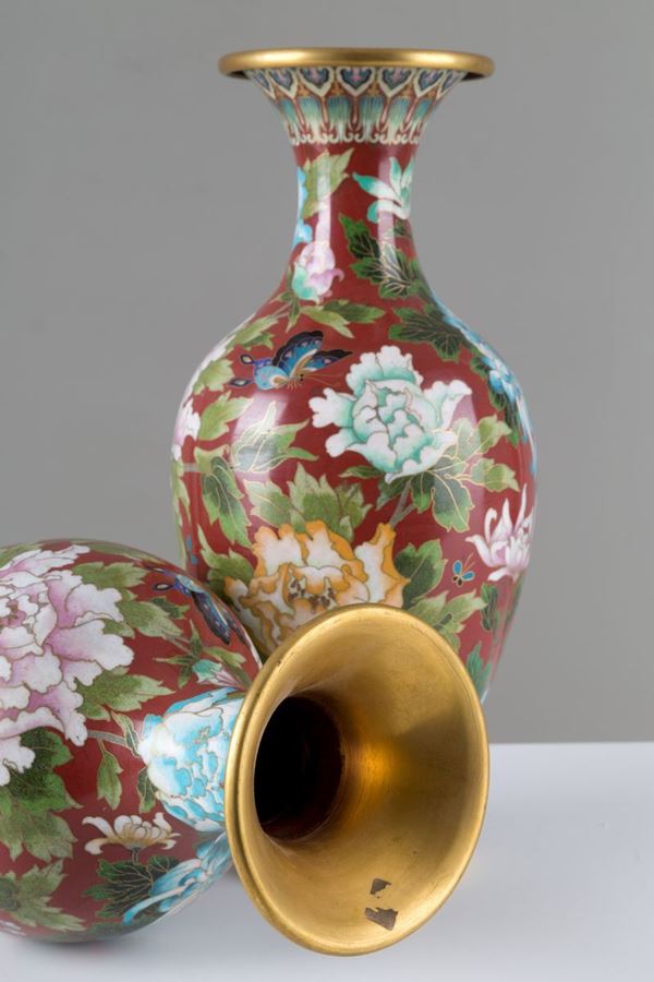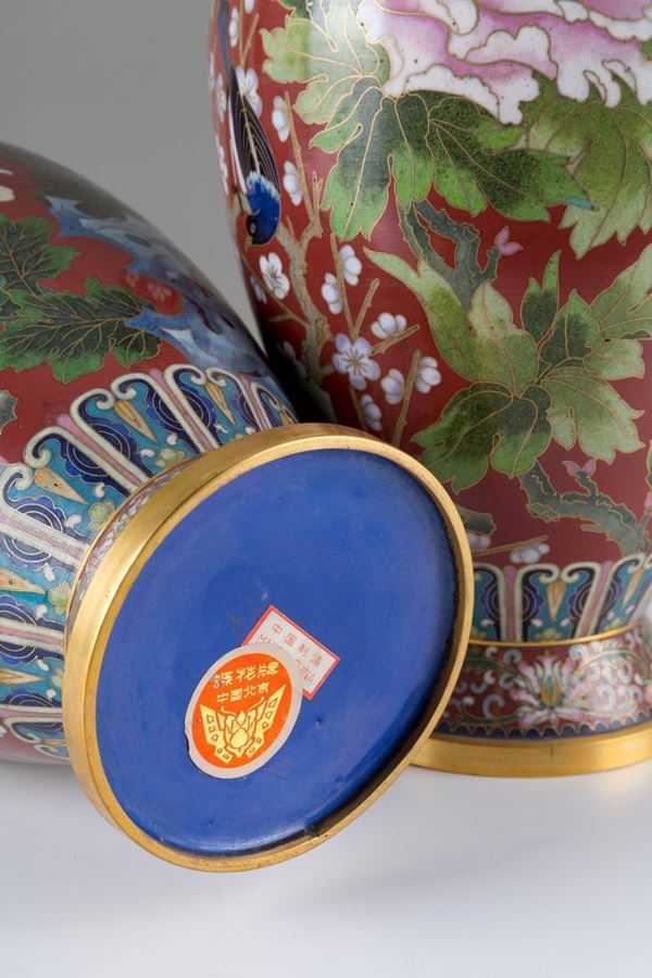 Coppia di vasi in metallo cloisonnÅ. Cina. XX secolo.