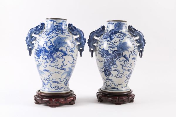 Coppia di vasi in porcellana bianca e blu con anse a guisa di draghi. Marcati sul fondo. Basi in legno. Cina. XIX secolo.