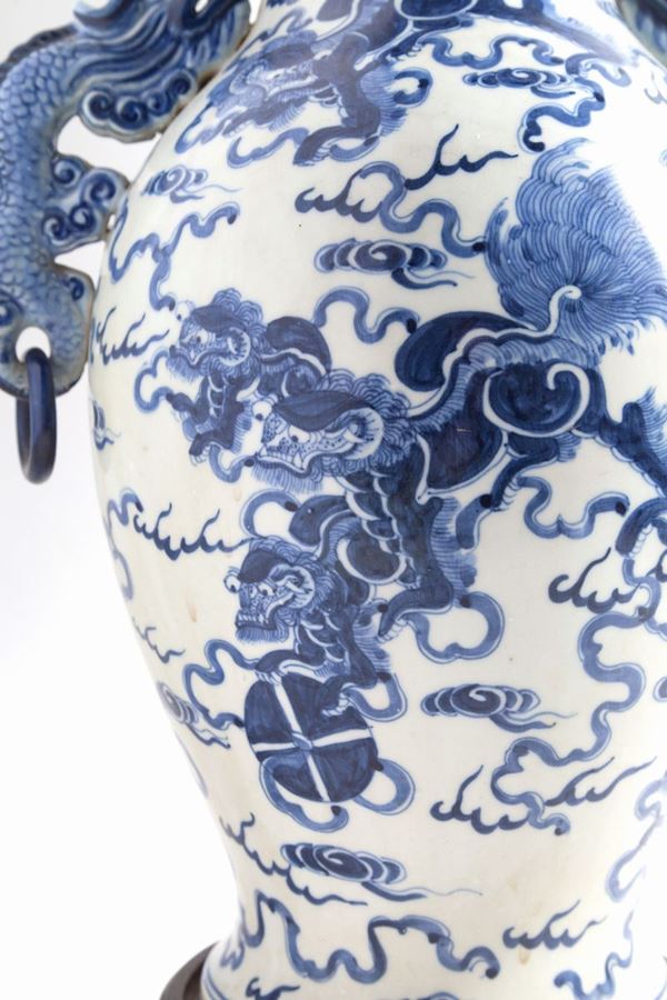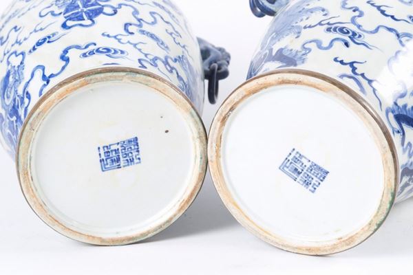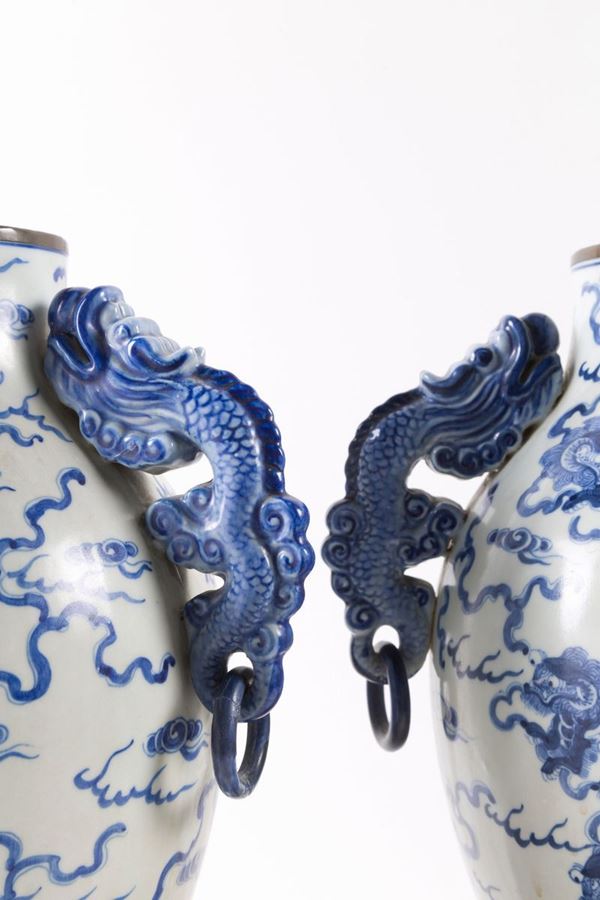 Coppia di vasi in porcellana bianca e blu con anse a guisa di draghi. Marcati s...