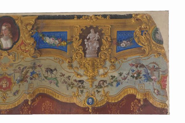 Dipinto olio su tela raff. ''FESTONI CON GHIRLANDE DI FIORI, ANIMALI E DECORAZIONI A TROMPE L'OEIL''. Inizi XIX secolo.