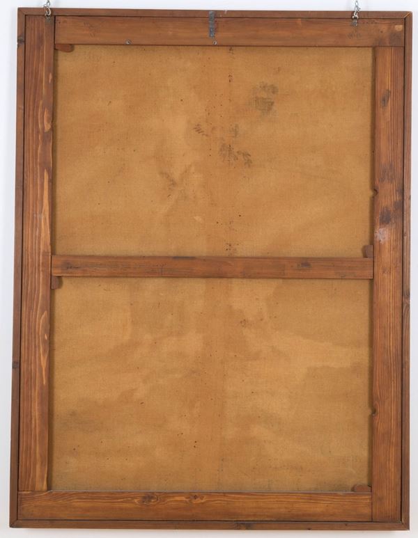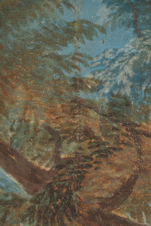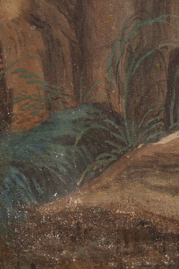 Dipinto olio su tela raff. ''PAESAGGIO MONTANO CON ARMENTI E PASTORI''. XVIII secolo. Difetti e restauri.