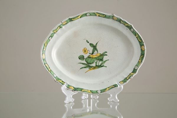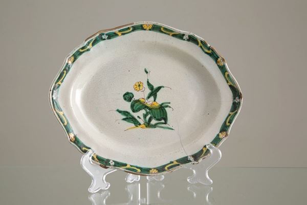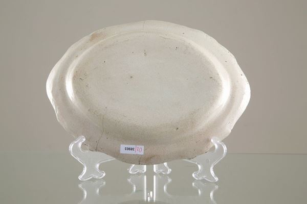 Due vassoi in maiolica di Cerreto. XVIII secolo. Difetti. Mis. Lung cm. 34, P...