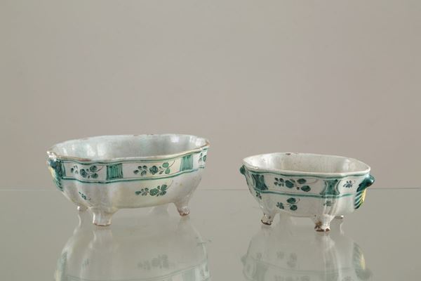 Due zuppiere in maiolica di Cerreto. XVIII secolo. Difetti. Mis. Lung. cm. 27...