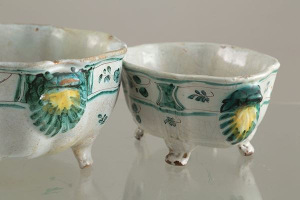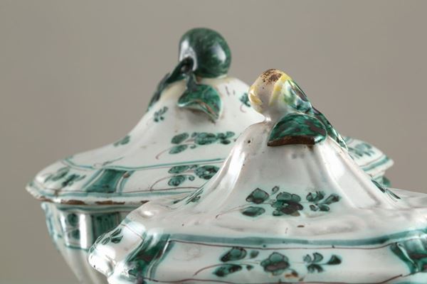 Due zuppiere in maiolica di Cerreto. XVIII secolo. Difetti.