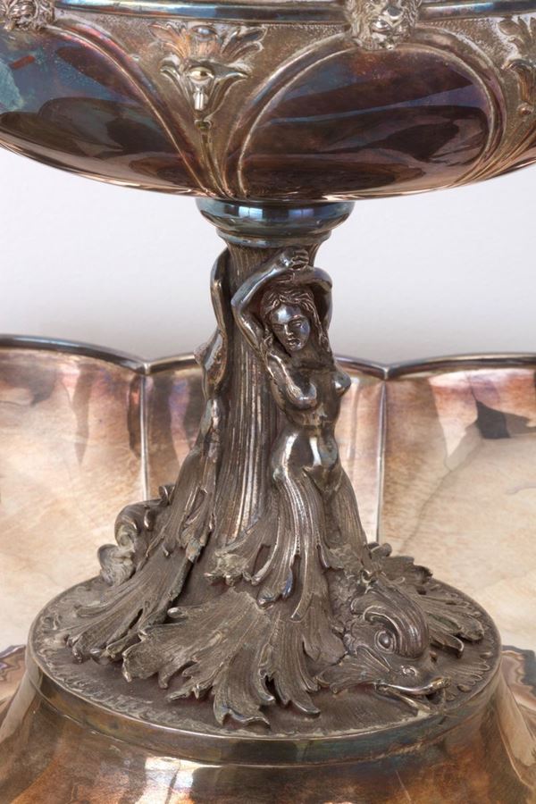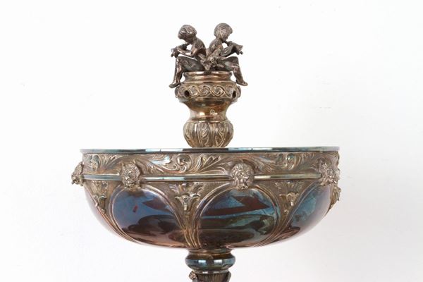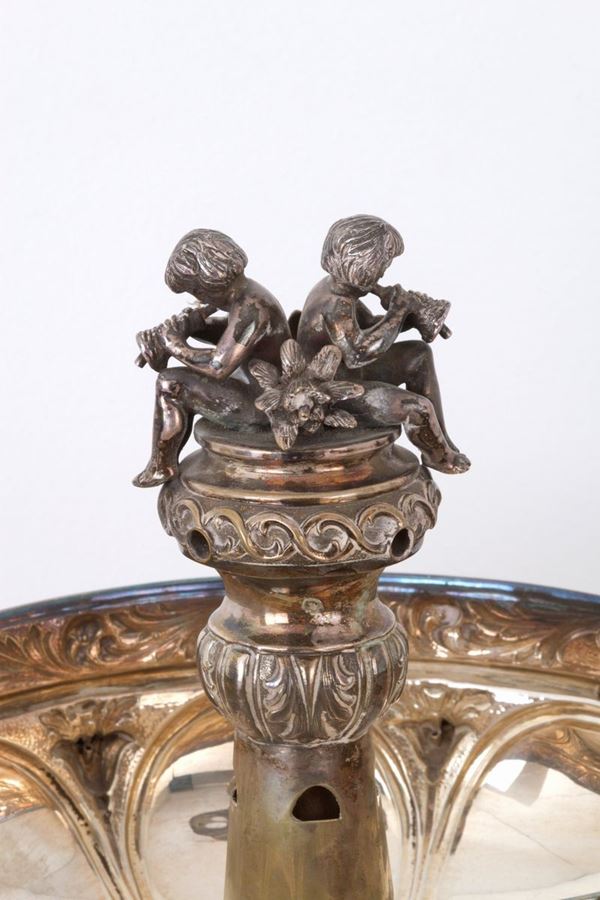 Fontana da tavolo in argento 800 sbalzato e cesellato. gr. 7000 ca. Base in mar...