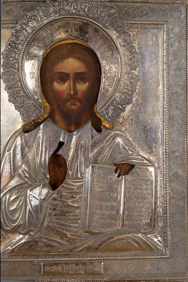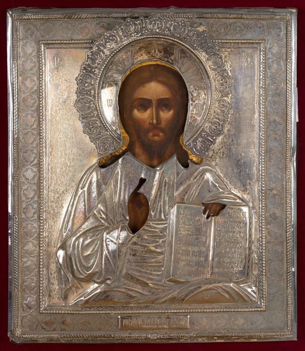 Icona su tavola raff. ''CRISTO'' con riza in argento. Russia. XIX secolo. In co...