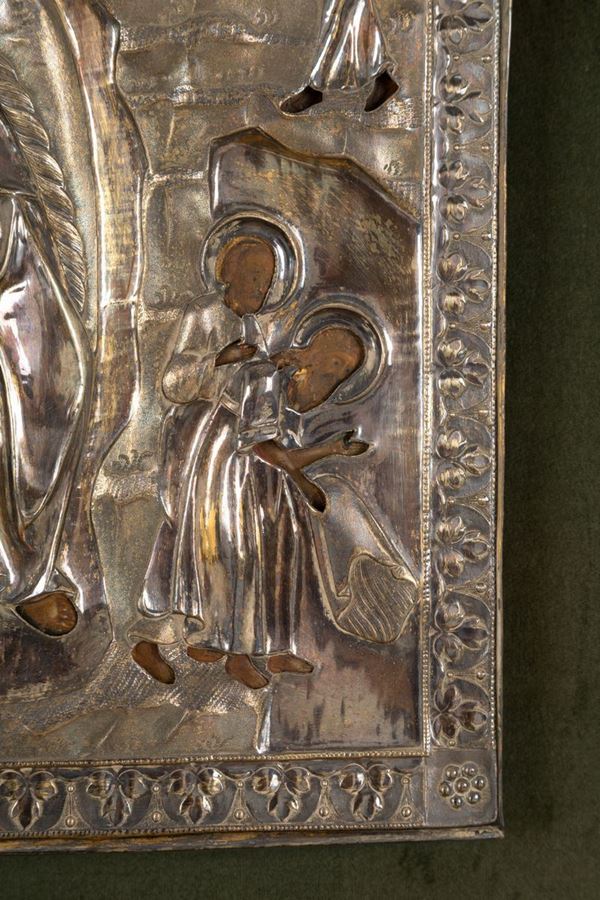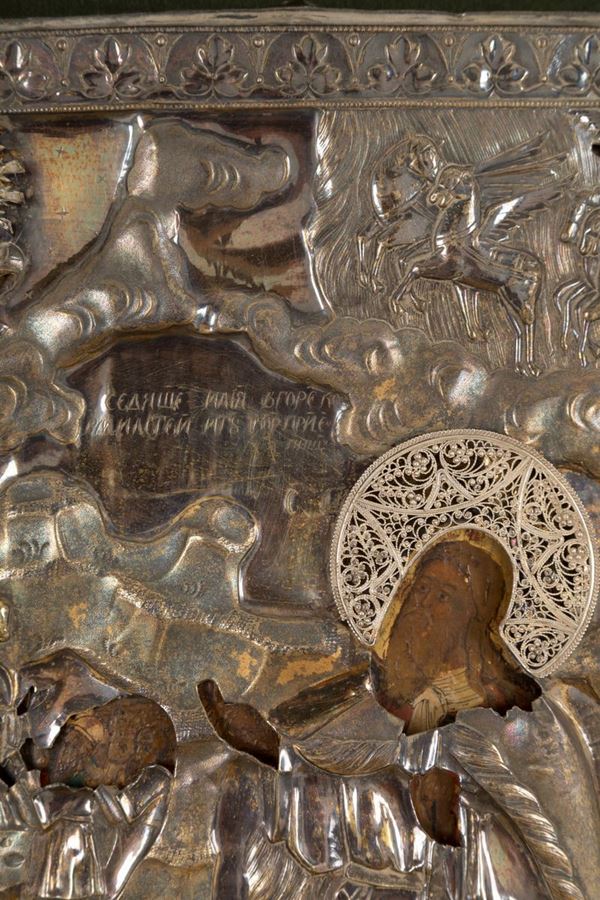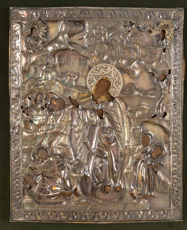 Icona su tavola raff. ''SCENE DI VITA DEL PROFETA ELIA'' con riza in argento. R...