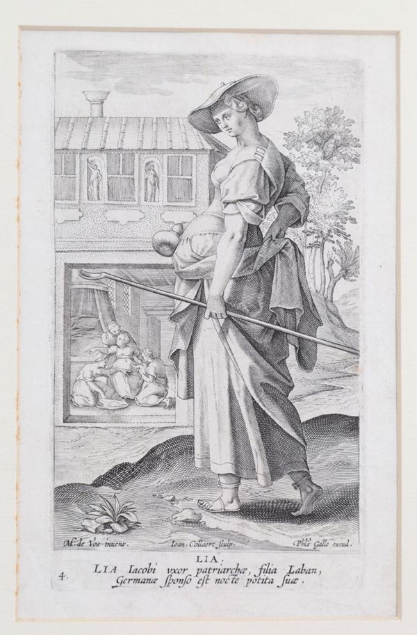 Incisione a punta secca su carta raff. ''LIA'' tratta da Icones Illustrium Feminarum Veteris Testamenti. Incisione di Jan Collaert il Giovane (1561 ca. - 1620 ca.), da un disegno di Maarten De Vos (1532-1603), pubblicata da Philips Galle (1537-1612). In cornice dorata.