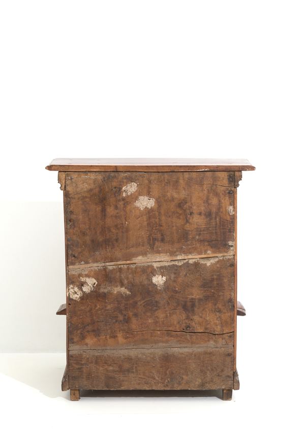 Inginocchiatoio in legno di noce intagliato con tre cassetti. Veneto. XVII secolo.