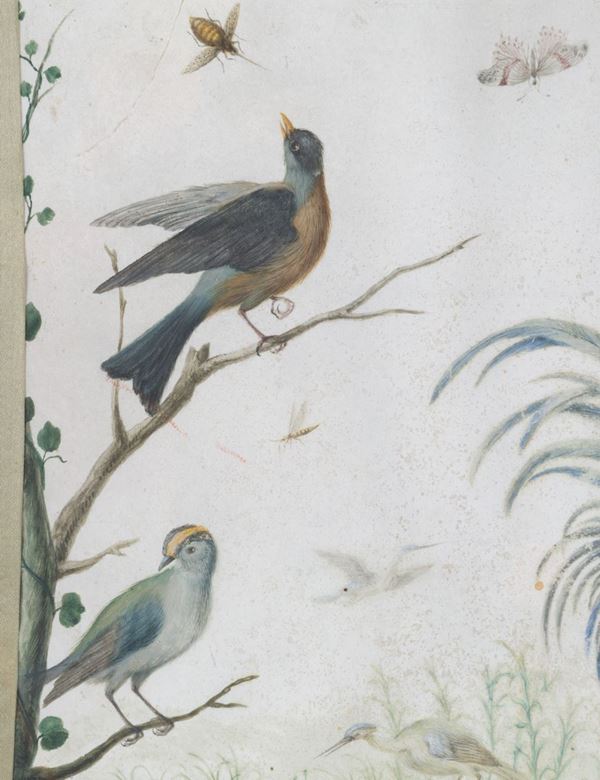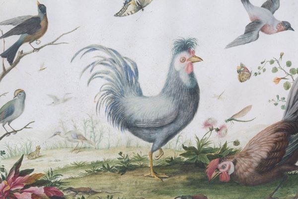 MAESTRO DEL XVIII SECOLO. Importante dipinto olio su pergamena raff. ''SOGGETTI NATURALI CON UCCELLI E INSETTI VARI''. In cornice. Lievi difetti.