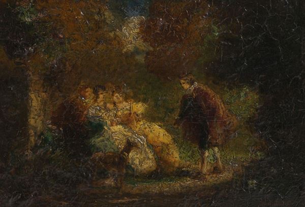 Dipinto olio su tavola raff. ''SCENA GALANTE NEL PARCO''