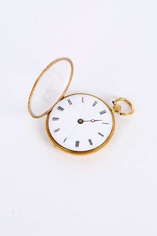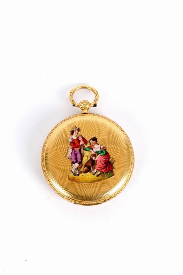 Orologio da tasca a ripetizione in oro giallo con dipinto a smalto raff. ''SCEN...