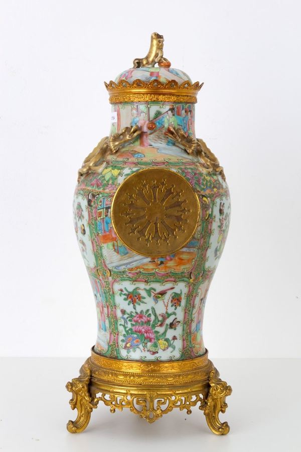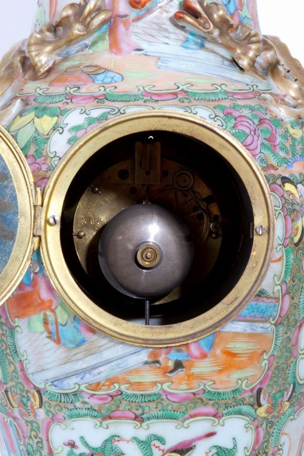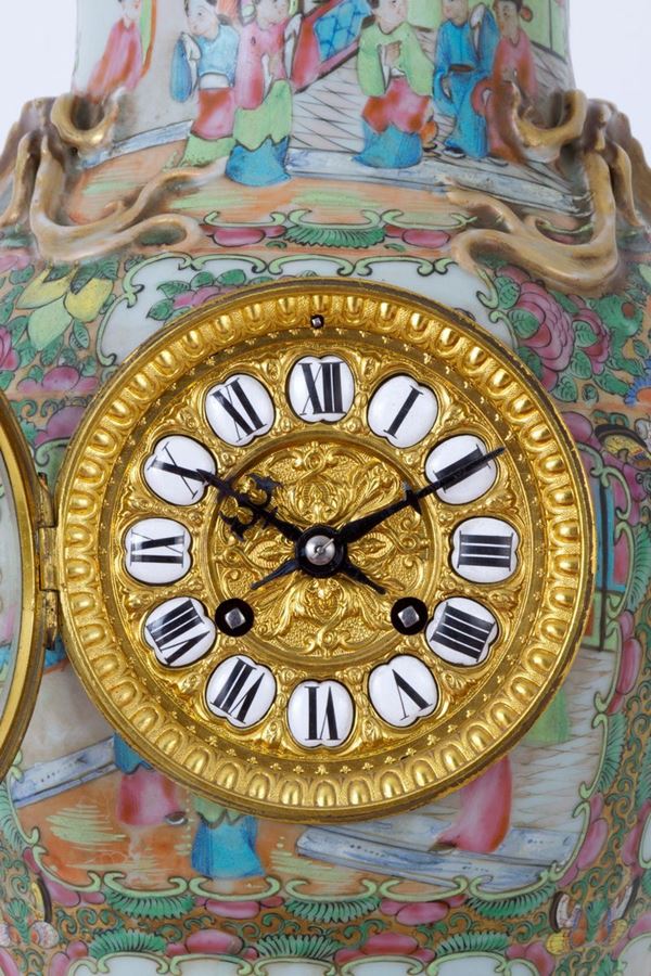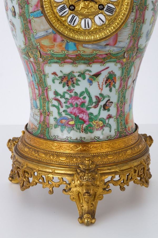 Orologio in porcellana con finiture in bronzo cesellato e dorato.Cina. XIX seco...