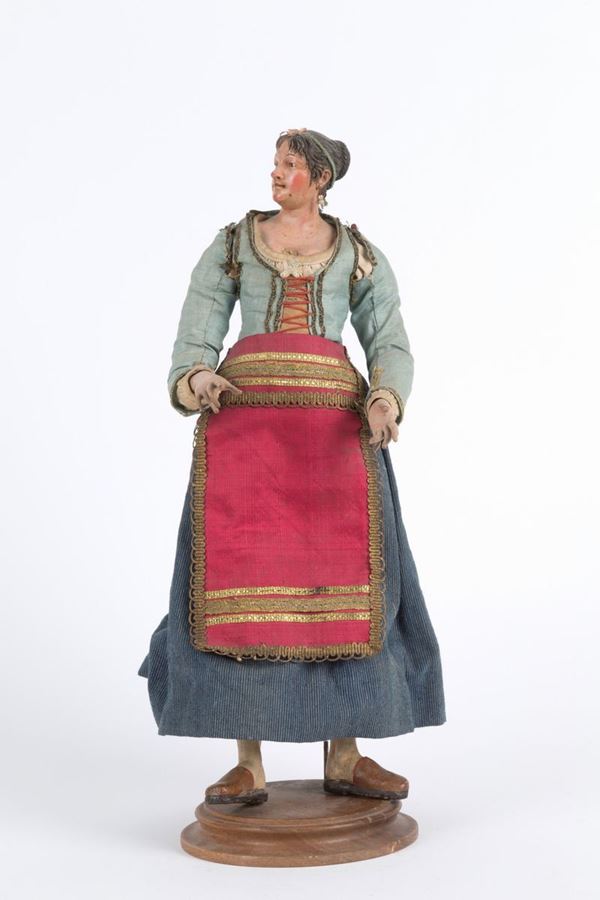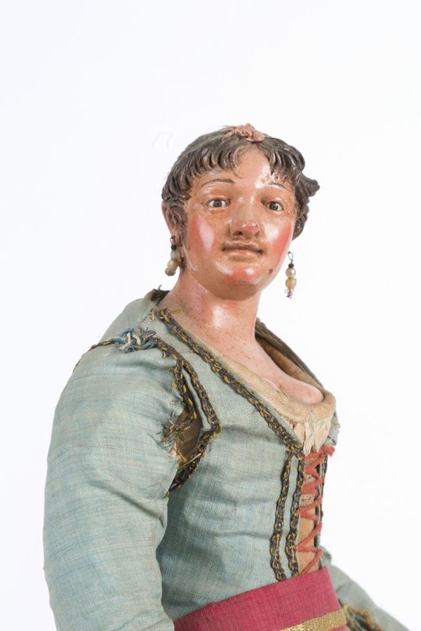 Pastorella in terracotta, legno, paglia e vestiti originali. Napoli. XIX secolo.