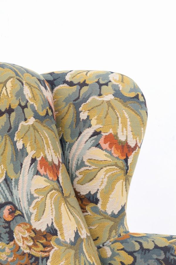 Poltrona BergÉre in legno e tessuto a motivo floreale con pouff. XX secolo.