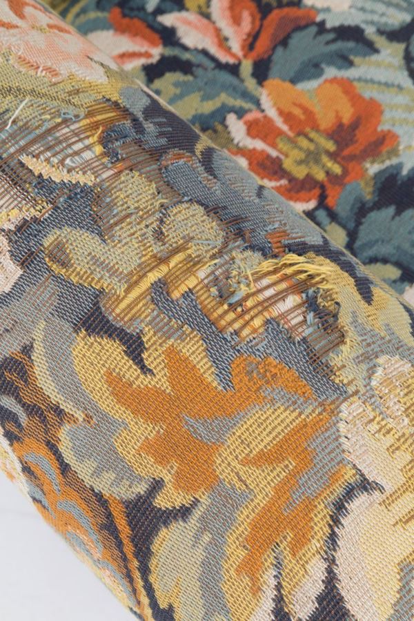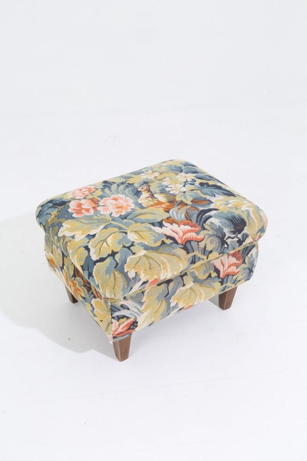Poltrona BergÉre in legno e tessuto a motivo floreale con pouff. XX secolo. Mi...