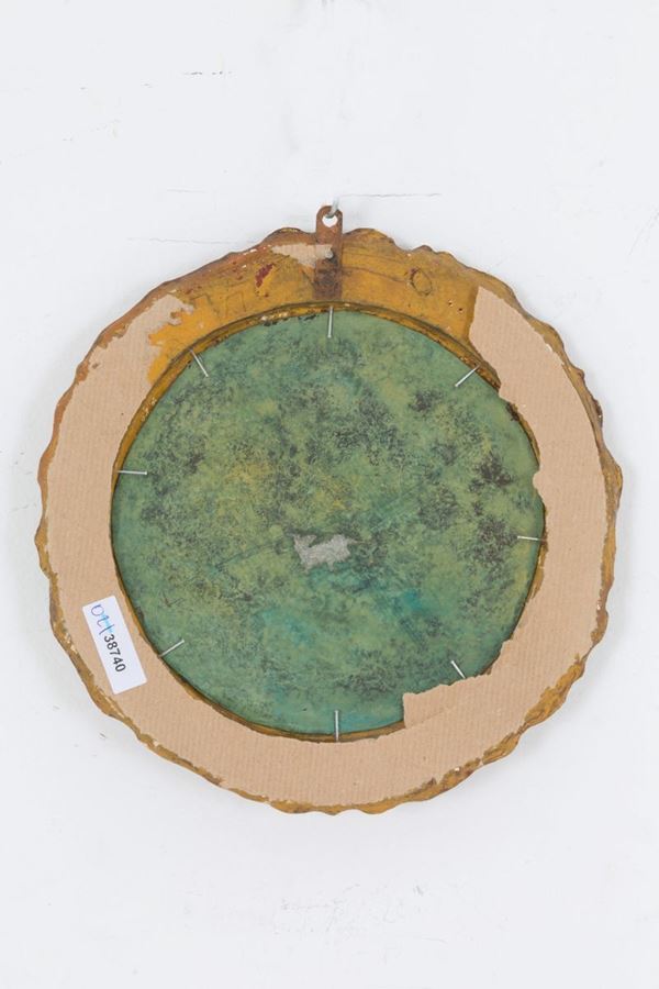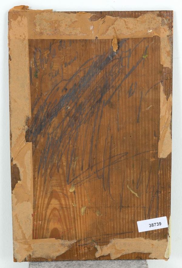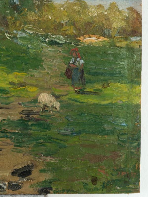 SILVIO POMA (Trescore Balneario, 1840 - Turate, 1932). Dipinto olio su tavoletta raff. ''CONTADINELLA CON PECORA E SULLO SFONDO VEDUTA DI LUGANO''. Firmato in basso a destra.