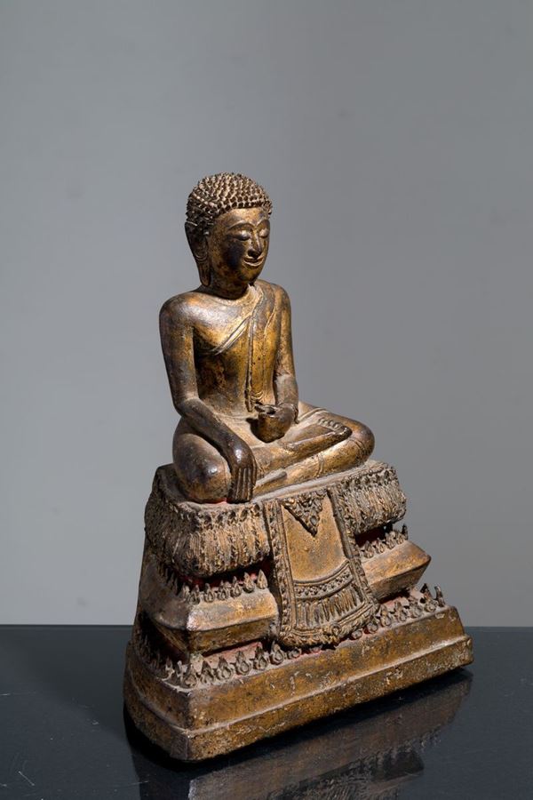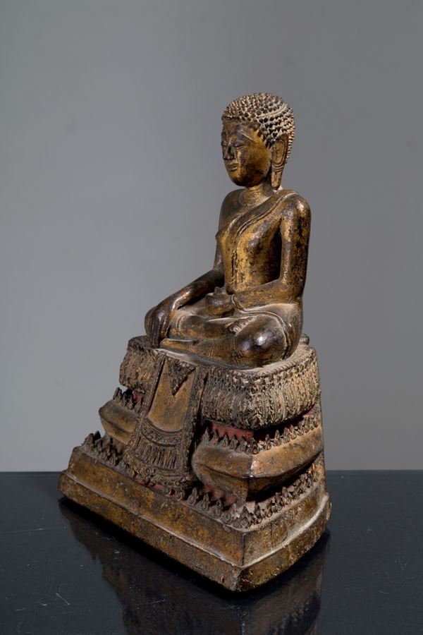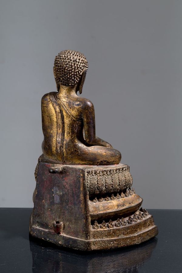 Scultura in bronzo raff. ''BUDDHA'' con tracce di lacca rossa sulla base. Thailandia. XVII secolo.