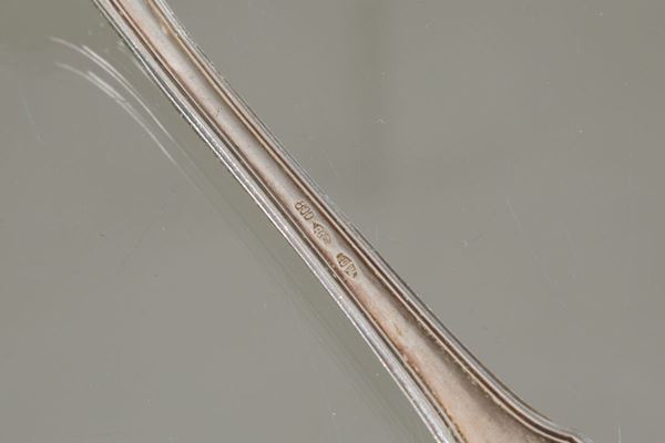 Servizio di posate in argento 800 composto da undici cucchiai grandi, undici cucchiai medi, undici cucchiaini, dodici forchette grandi, dieci forchette piccole, una spatola, un mestolo, un cucchiaio da servizio, dodici coltelli grandi, undici coltelli medi, dodici coltelli da dolce e dodici forchette da dolce, gr. 4800 ca. complessivi. XX secolo.