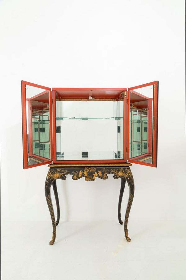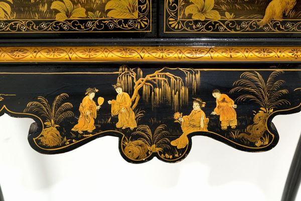 Stipo in legno laccato nero con decorazioni in oro a chinoiserie. Inizi XX secolo.