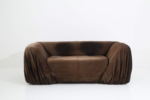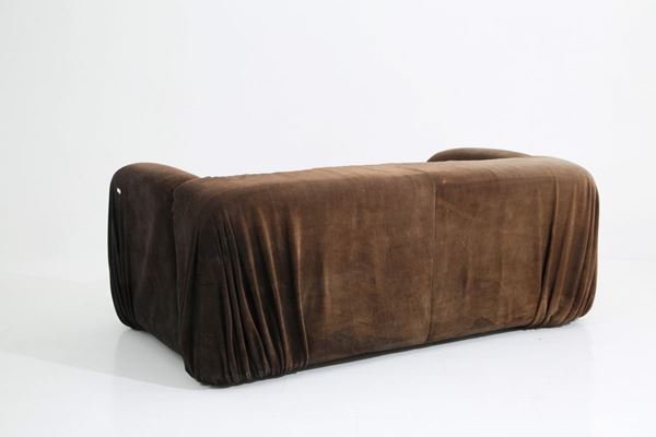 BEPPE VIDA alias MISTER LUNA. Divano mod. Progetto 84 in legno e corda con rivestimento in alcantara marrone. Manifattura LE COQUELICOT. Anni '70.