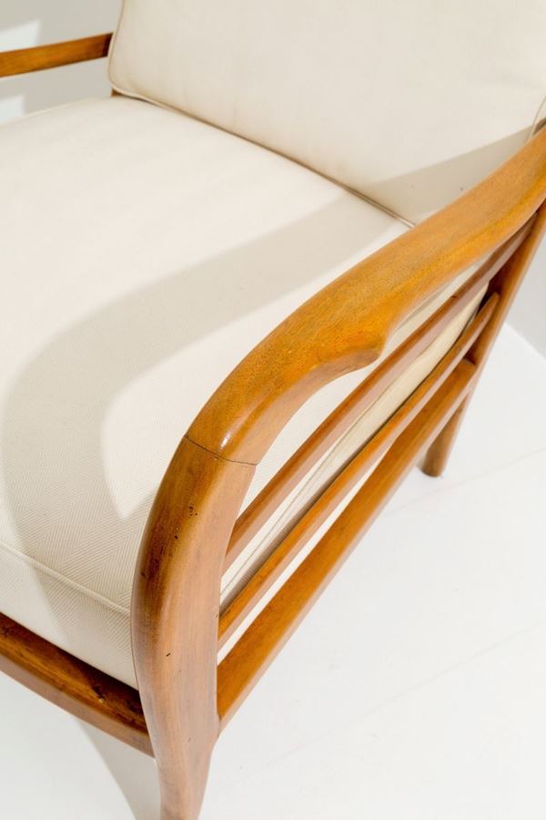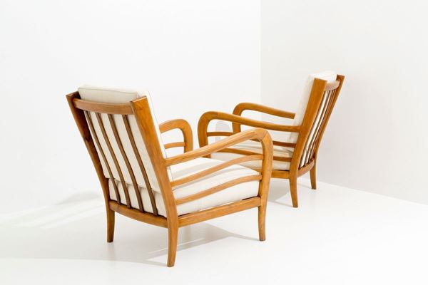 PAOLO BUFFA (Milano, 1903-1970). Due poltrone in legno e cotone bianco. Anni '50.