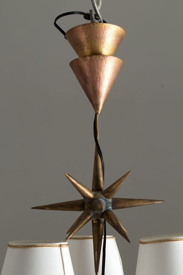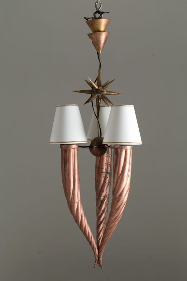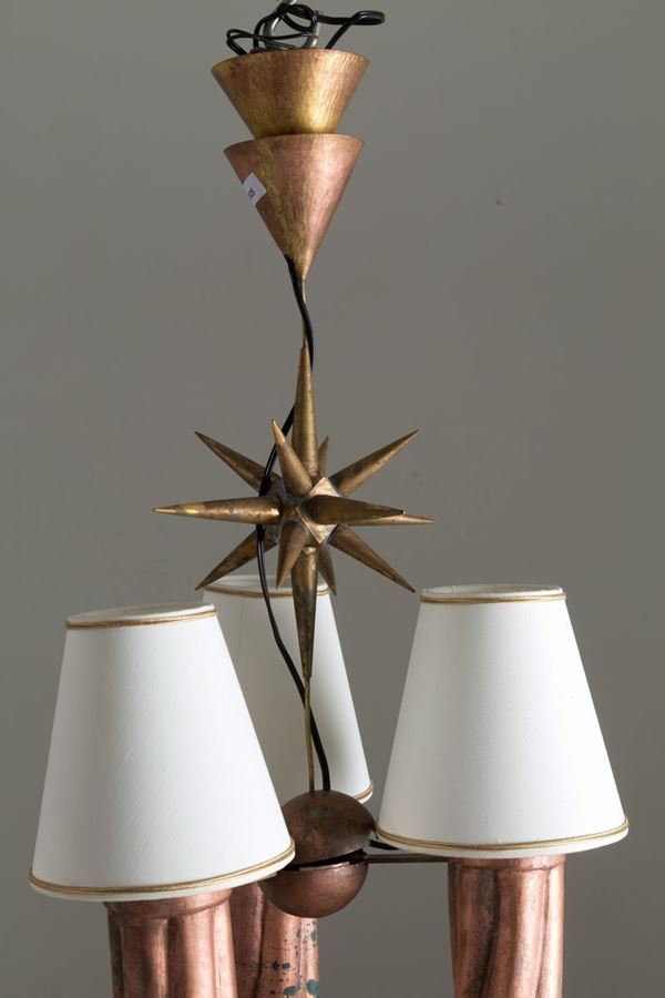 PAOLO BUFFA (Milano, 1903-1970). Lampadario tre luci in rame e ottone. Anni '40.