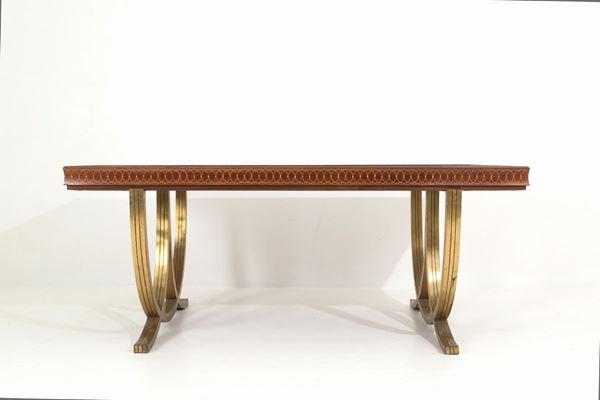 PAOLO BUFFA (Milano, 1903-1970). Tavolo con piano in legno a intarsi e gambe sagomate in ottone. Anni '40.