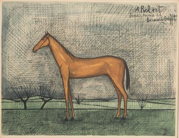 BERNARD BUFFET (Parigi, 1928 - Tourtour, 1999). Litografia su carta raff. ''CAVALLO''. 1951. Esemplare 198/300. In cornice.
