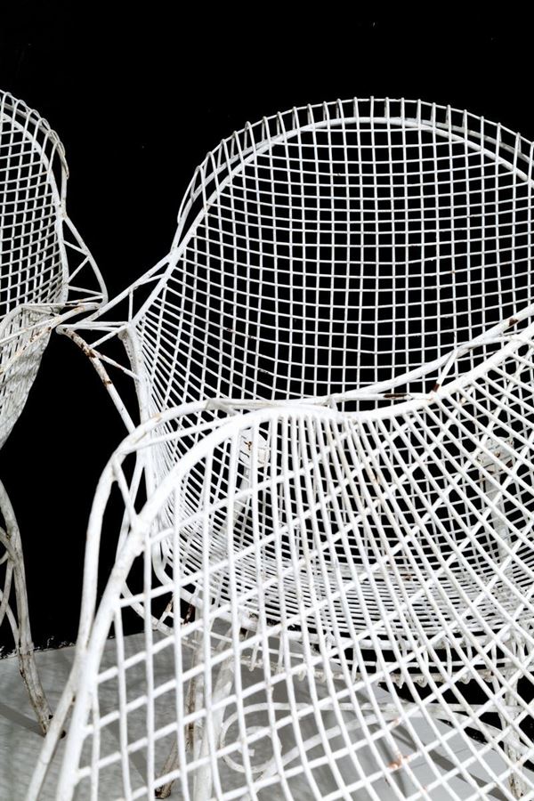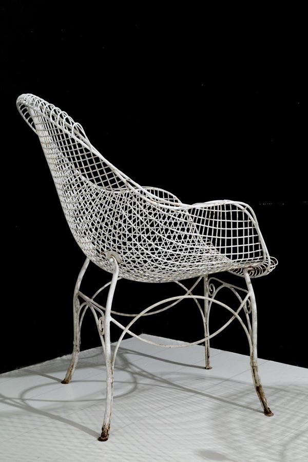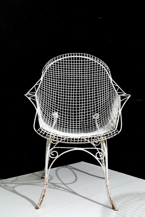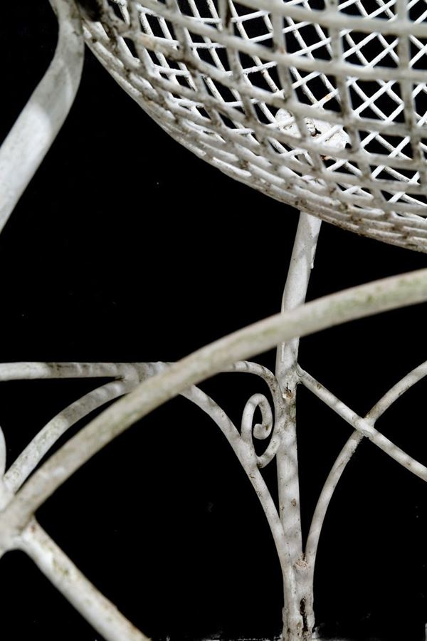 Cinque poltroncine da giardino in acciaio verniciato bianco con basi in ferro battuto. Anni '50.