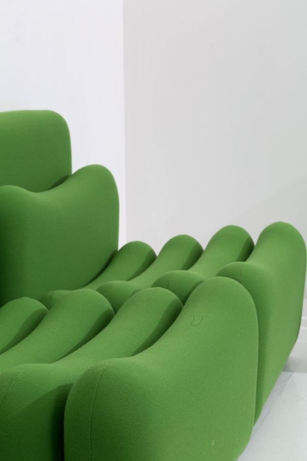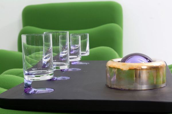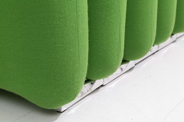 JOE COLOMBO (Milano, 1930-1971) per SORMANI. Set living Additional-System in metallo verniciato e tessuto verde. Composto da quattro poltrone, una chaise longue e un poggiapiedi con vassoio in legno ebanizzato alloggiante quattro bicchieri Smoke e un posacenere Biglia in cristallo, disegnati da JOE COLOMBO per ARNOLFO DI CAMBIO. Con marchio del produttore. Anni '60-'70.