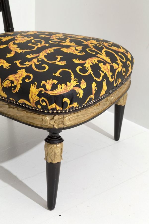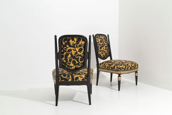 Coppia di poltrone in legno e tessuto fashion. XX secolo....
