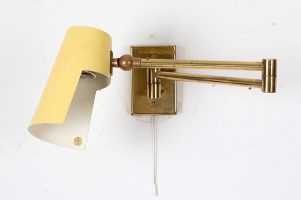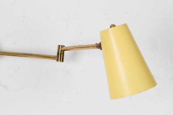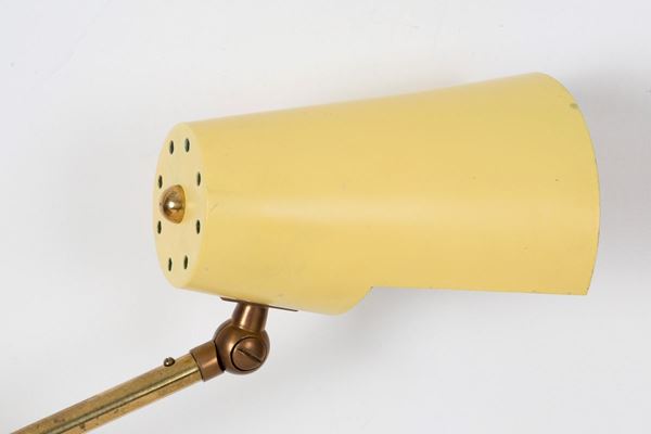 Due lampade da muro in ottone dorato e metallo verniciato giallo e beige. Produzione STILNOVO. Con etichette del produttore. Anni '50.