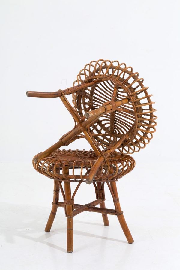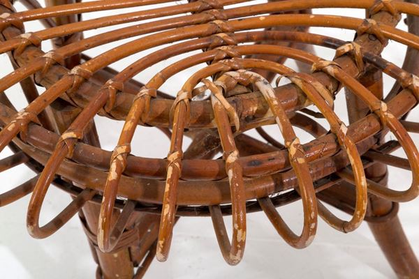 Due sgabelli bassi in rattan. Manifattura italiana. Anni '50. Difetti....
