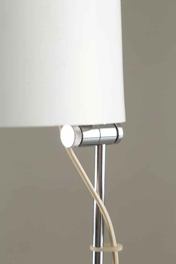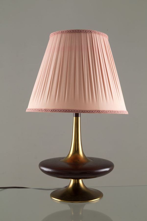 Lampada da tavolo in ottone con base in legno e paralume in seta rosa. Anni '50...