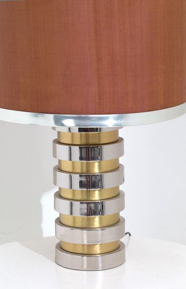 Lampada da tavolo in ottone e metallo cromato con paralume in stoffa marrone. Manifattura italiana.