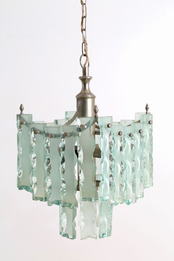 Lampadario a sette luci in vetro e metallo. Produzione ZEROQUATTRO. Anni '60. D...