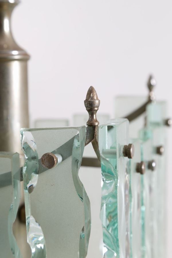 Lampadario a sette luci in vetro e metallo. Produzione ZEROQUATTRO. Anni '60. Difetti.