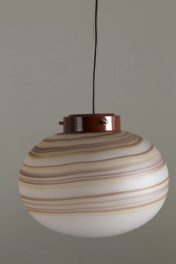Lampadario in vetro di Murano con spirale color nocciola su vetro satinato e coprifili in ottone. Produzione VISTOSI. Anni '70.